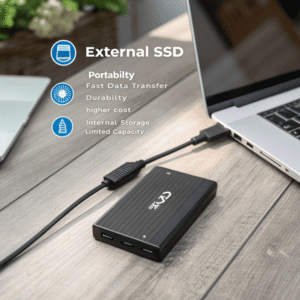 External SSDs provide fast read/write speeds, silent operation, resistance to shock, and compact size. They make backups, file transfers, and portable workflows much more efficient and secure.